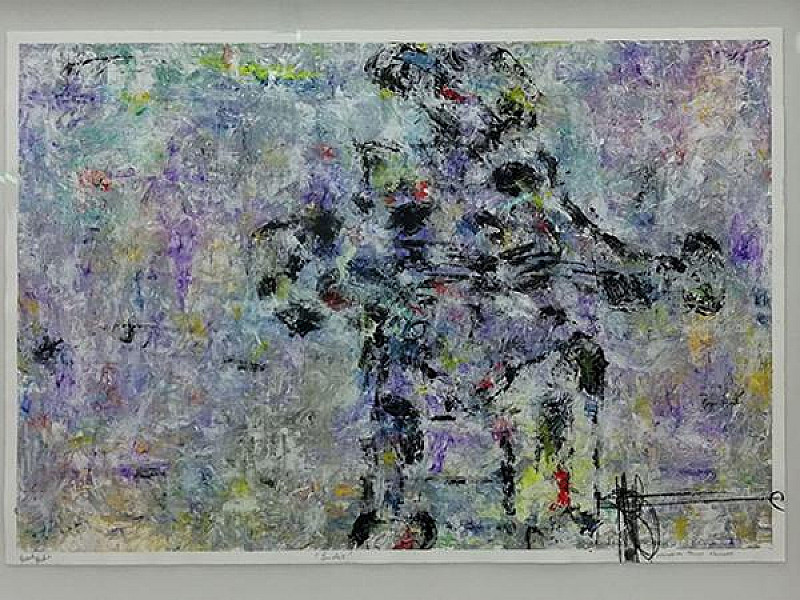 The image depicts a woman playing the guitar. Inspired by the entertainment of public basking around the world