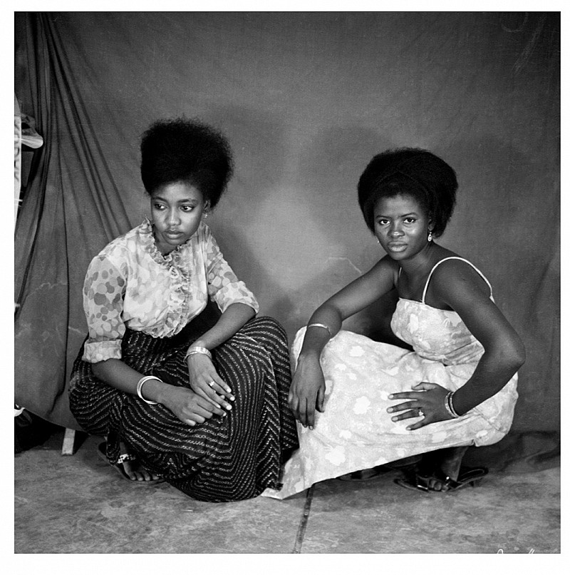 In this photo taken in Philippe Koudjina's studio, two young ladies wearing an afro are elegantly squatting, in a fashion that was common at the time.