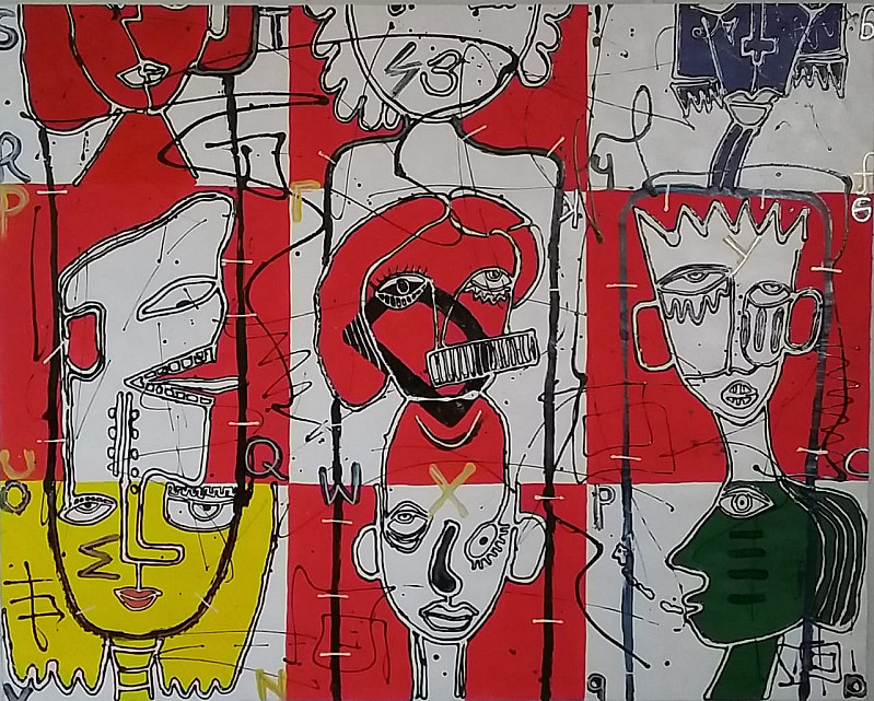 in the painting has a beer mug (Negative?) as an eye and coffee mug (Positive?)