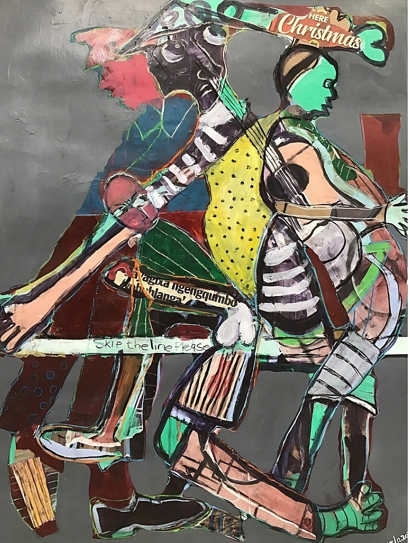 The abstracted figures show visionary energy between nature and the law. It is a fusion of free will and it’s arrested development. I illustrate my emotions to widely touch on issues of gender, the abuse of women, sex crimes and greed. I believe that in our generation the unfairness of law is that it is not just as it favours the most powerful who live beyond it or hand it down to us. The writings on the painting expresses the terms used by those in power to carry the fragile law because it keeps getting broken piece by piece and it get too old to carry, as long as it is beneficial to them.